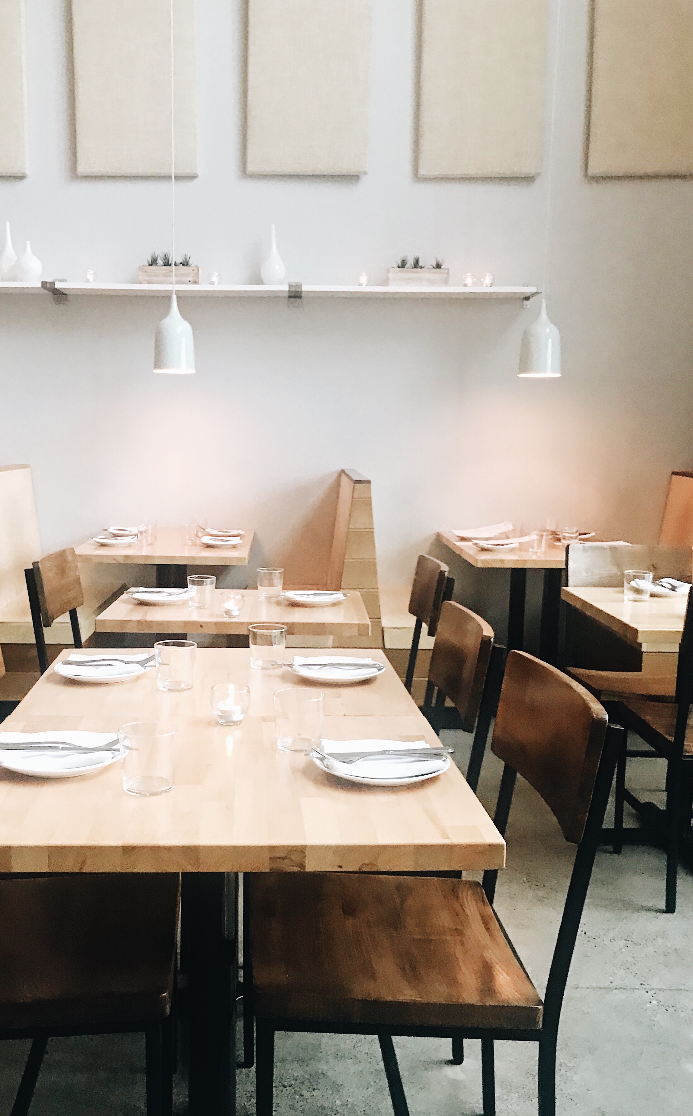 The bi-level space features floor-to-ceiling windows, a chef’s counter, a tiny six-seat bar in the back, and a minimalist design.