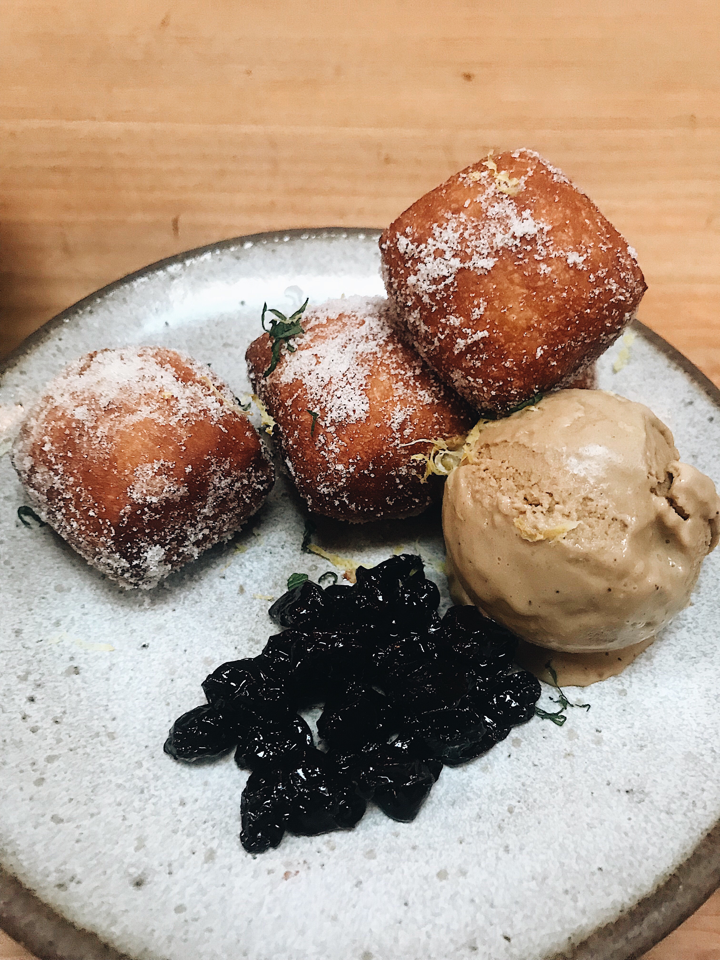 Lemon sugar donuts with cherry preserves, Minot and coffee-nocino ice cream