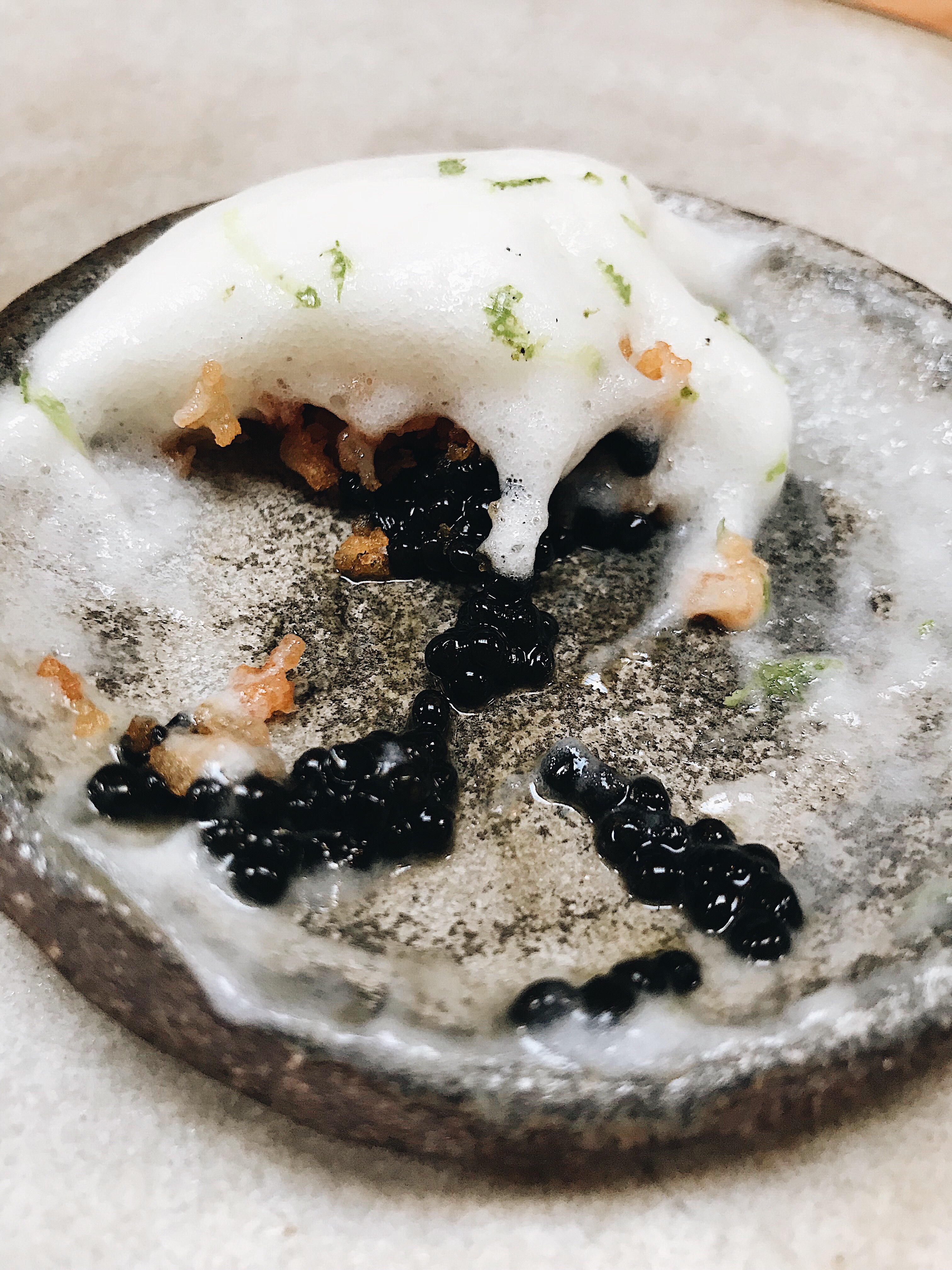 Crispy potato topped with California Sturgeon caviar and potato foam
