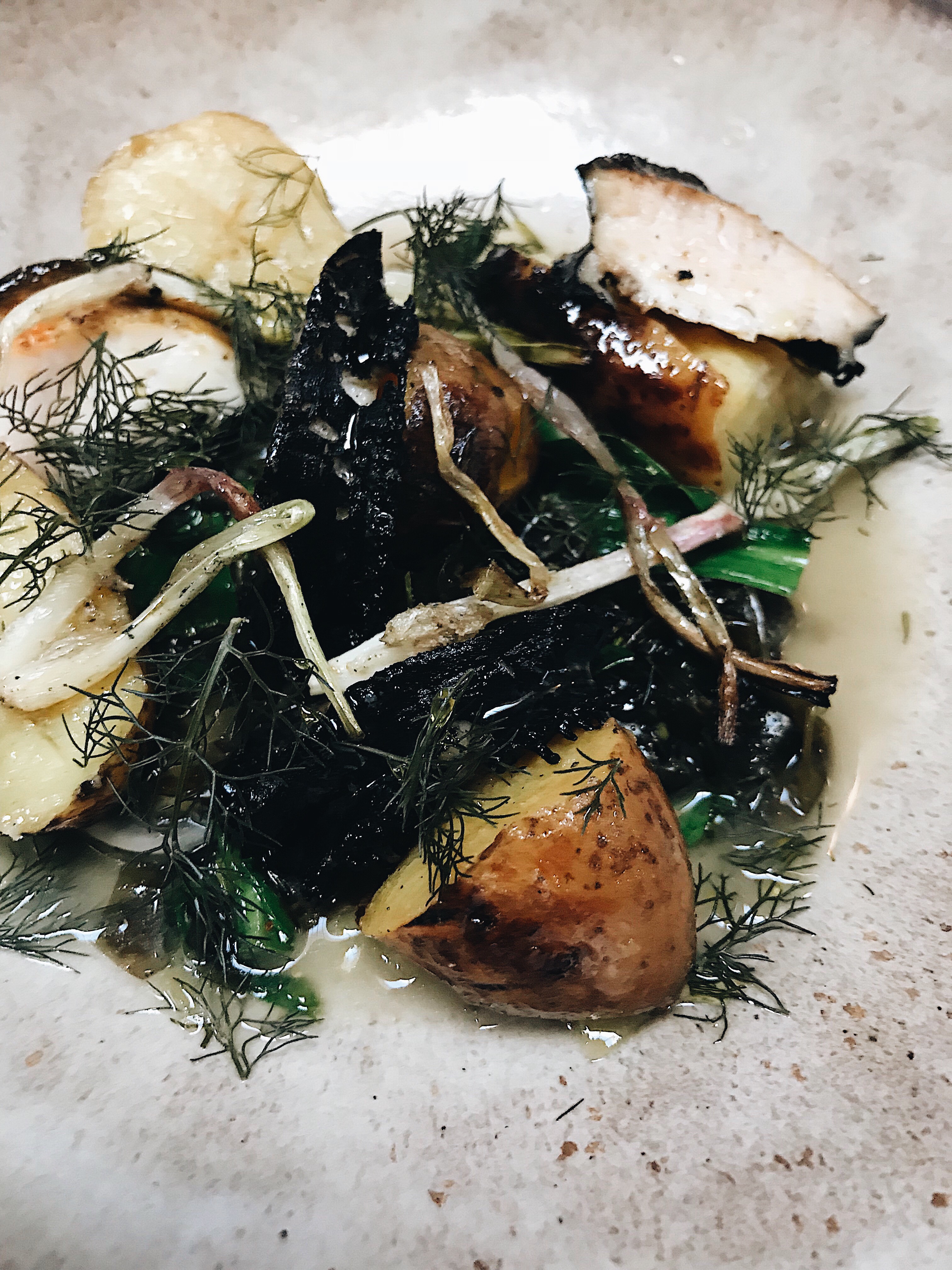 Grilled Monterey Bay Abalone with crushed prince of orange potatoes in ramp-yuzu-seaweed butter