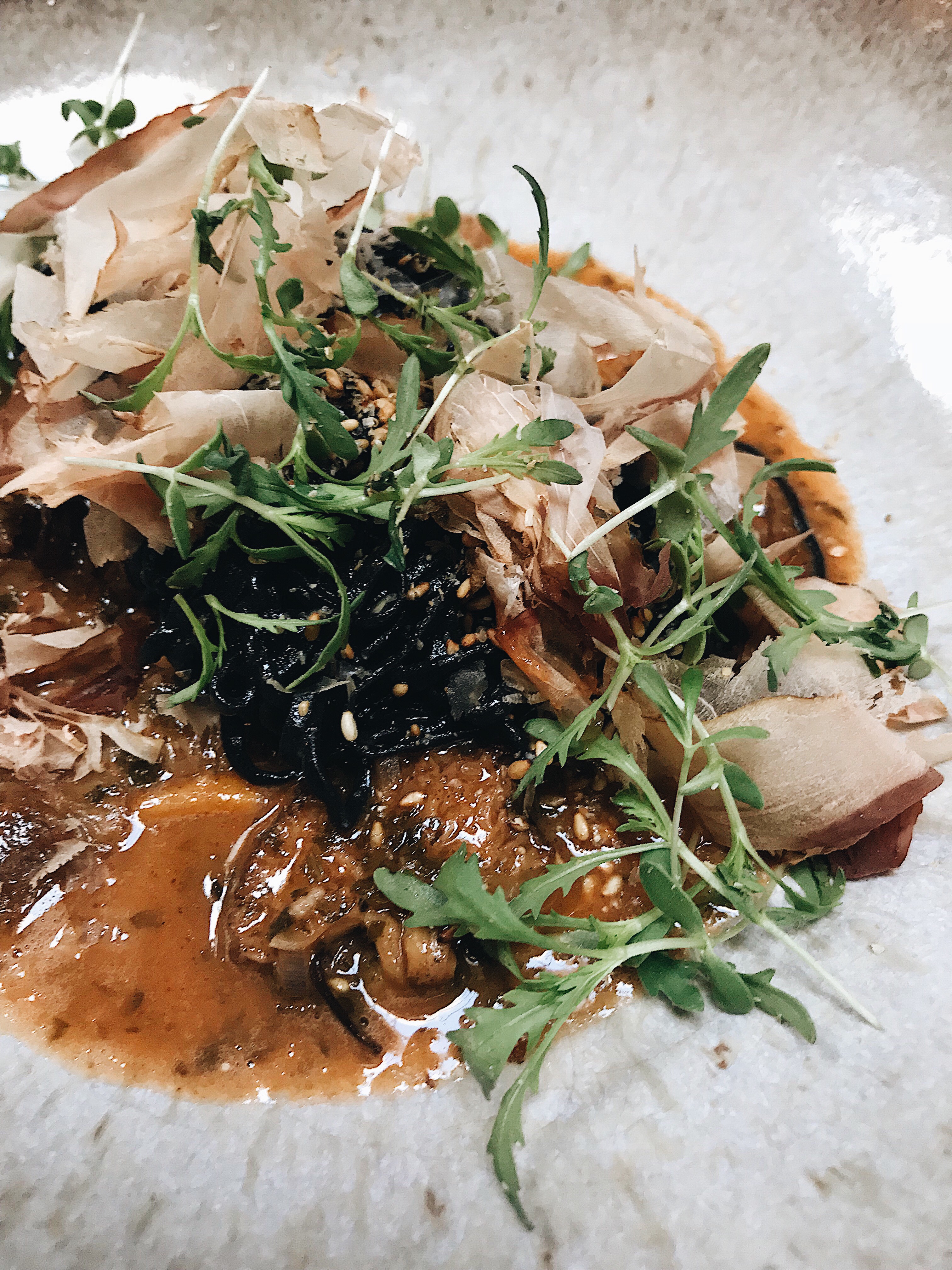 Squid ink noodles with yellowfoot mushrooms, kale & bonito flakes