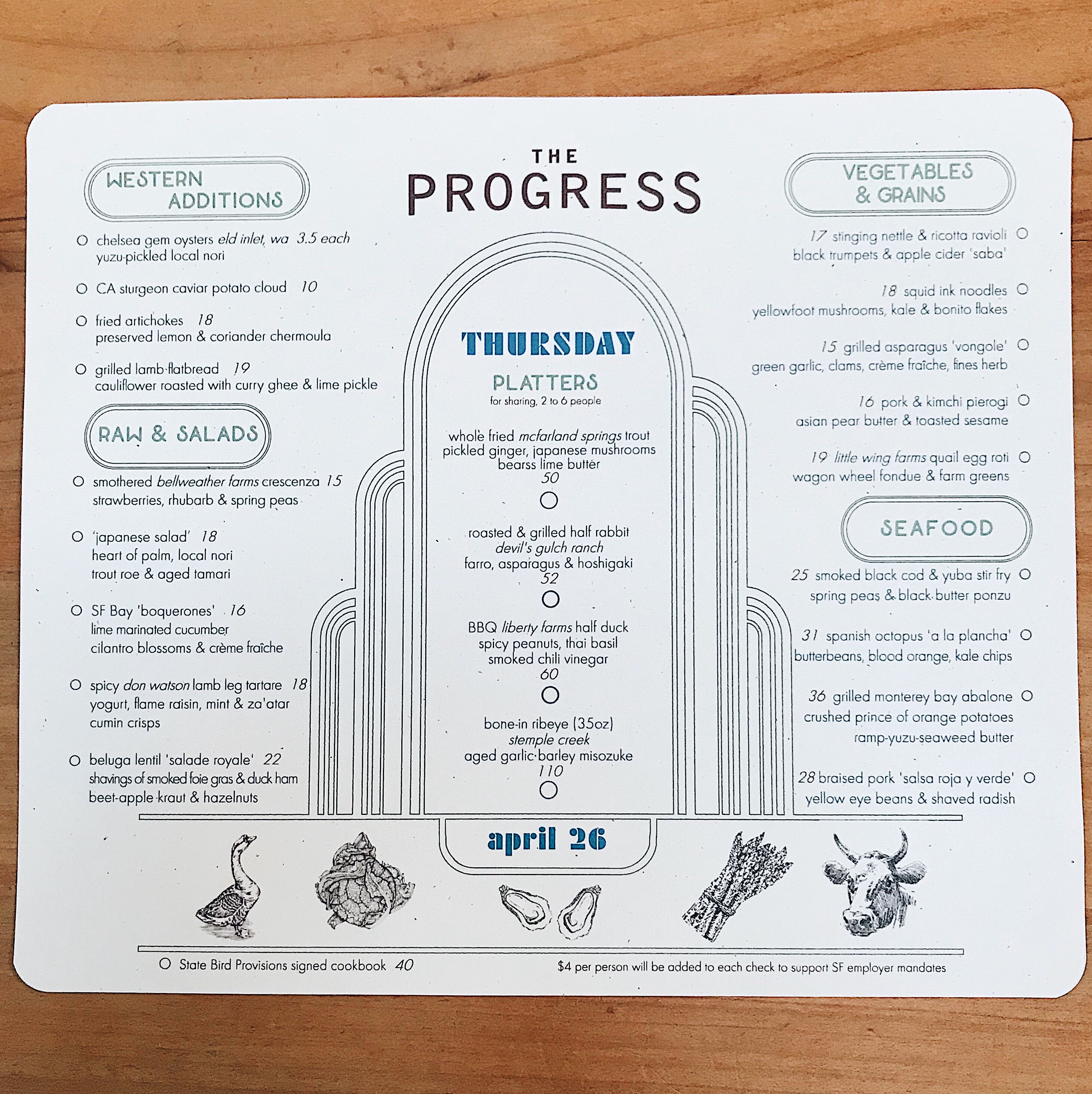 The Progress is a la carte dishes served family style using all local Northern California ingredients. The menu evolves from small plates like potato clouds to large, family-style platters like barbecued duck or slow-cooked rabbit. The food is simple, yet transcends its ingredients to a satisfying, unexpected level that had me wanting to eat more despite being full.