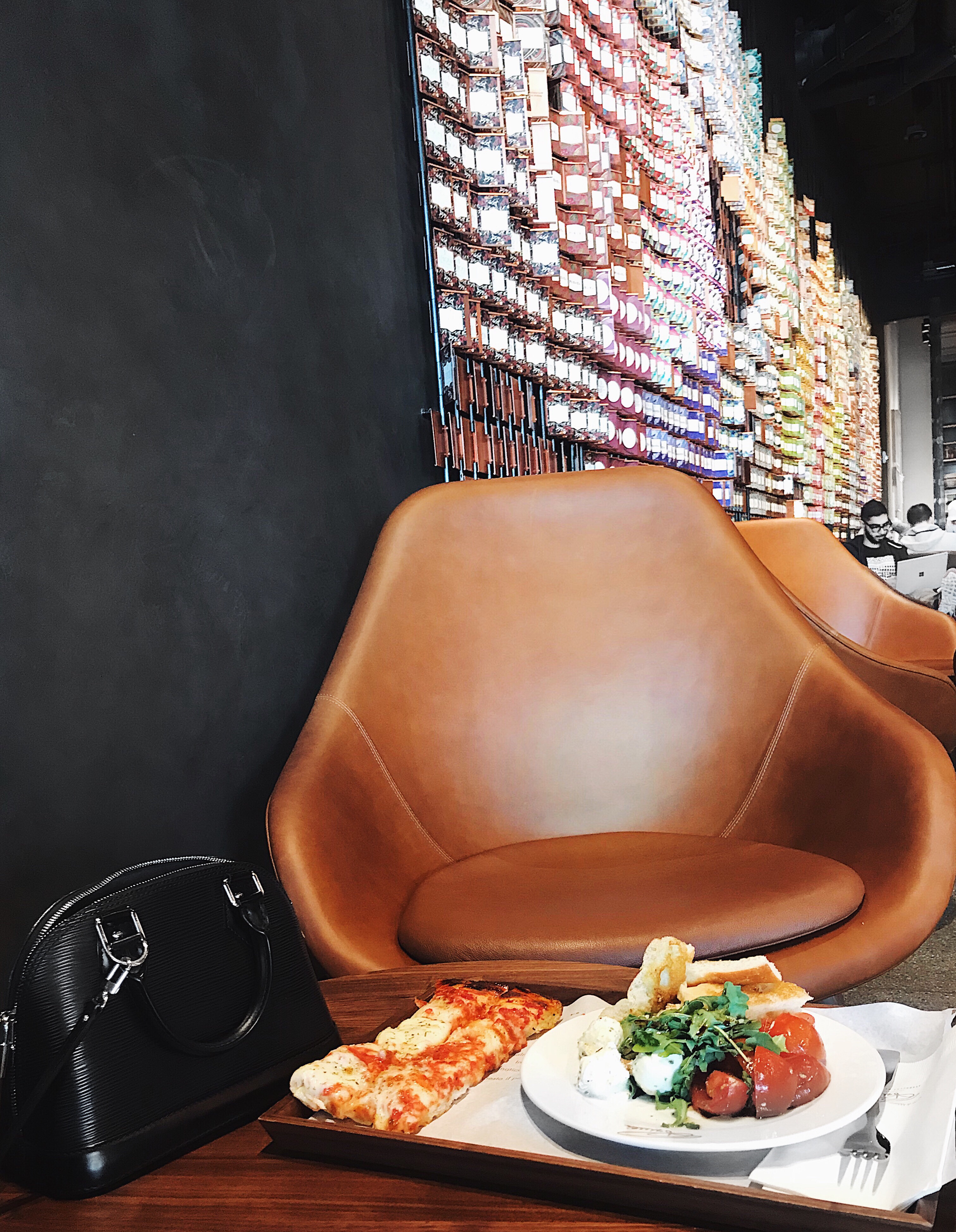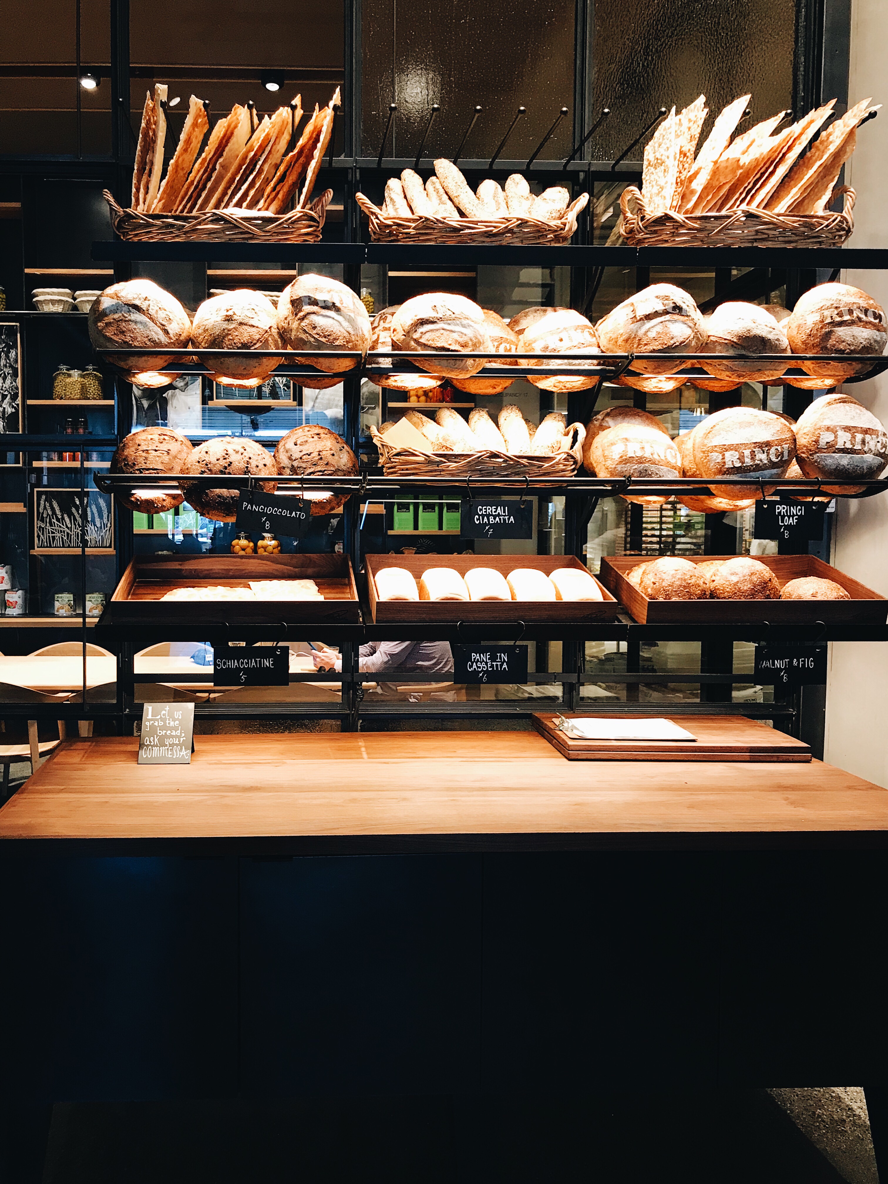 Just steps beyond the bar, you’ll find the Princi bakery. Bakers dressed in white pull steaming trays of pizza and bread out of giant ovens. Pizza, pastries, salads, and cakes are ready for you to order.