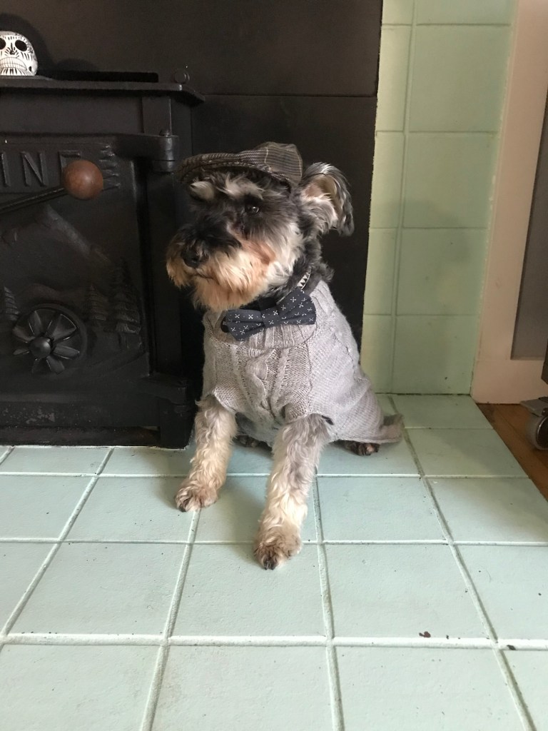 But still, I set an alert for Emerald City Pet Rescue on Pet Finder, just in case. When a cute little Mini Schnauzer wearing a goddamn old man newsboy cap popped up on PetFinder, I knew I needed to meet him immediately. First, I emailed, then I called Emerald City Pet Rescue as soon as they opened. Gus and I went to meet Huxley the next day. I fell in love with him immediately.